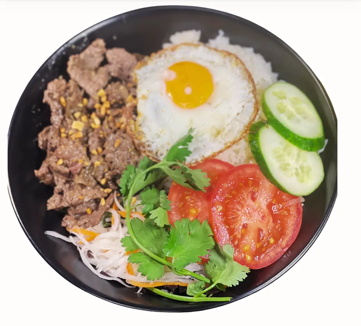 Gluten-free rice topped with stir-fried beef, egg, cucumber, tomato and herbs.