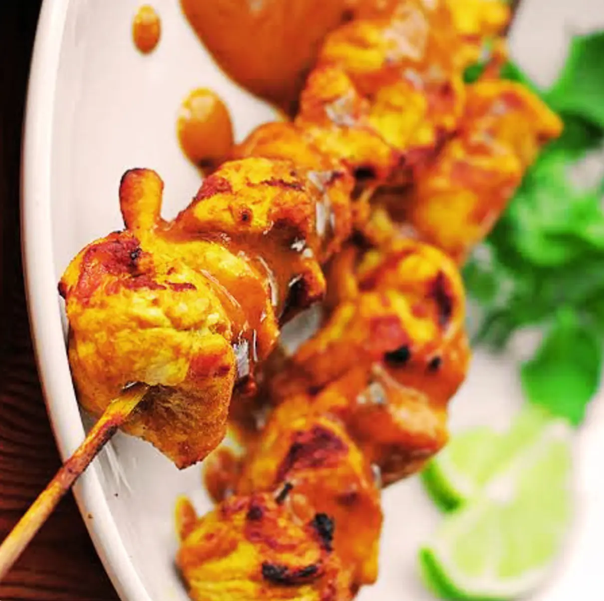 Grilled marinated chicken skewers served with rich dipping sauce.