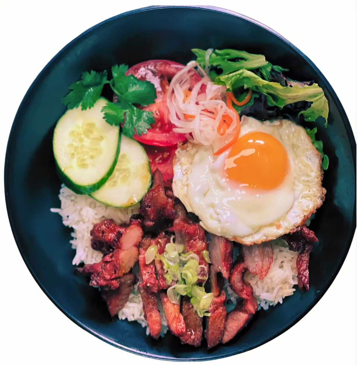 Gluten-free rice topped with grill pork, egg, cucumber, tomato and herbs.