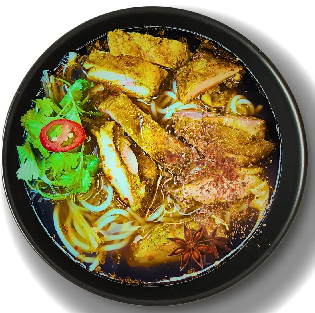 Clear chicken broth with gluten-free noodles, sliced chicken, bean sprouts, spring onion, coriander and a red chilli garnish.